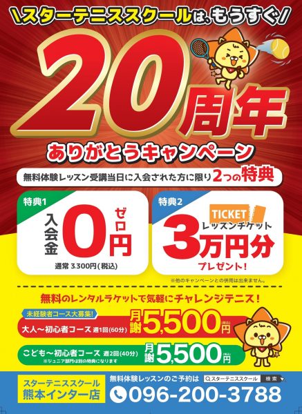 スターテニススクールはもうすぐ20周年を迎えます!本当にありがとうございます!