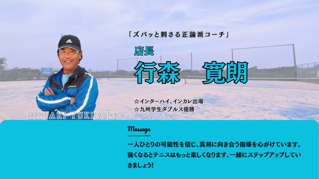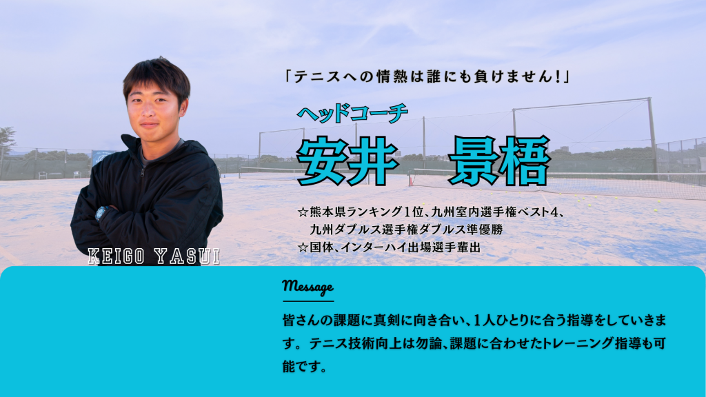 - 熊本県No.1の実績を持つトッププレーヤー: 圧倒的な技術を間近で体感いただけます。ラケット、トレーニングのアドバイスも好評。