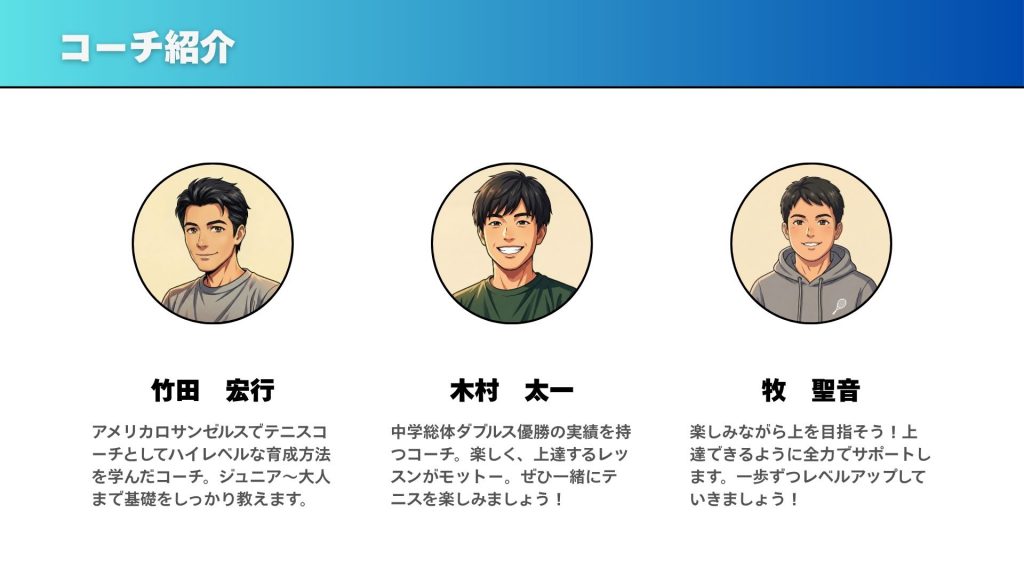 - 本場アメリカ仕込みのジュニア指導: アメリカプロテニス協会認定インストラクターが世界基準のコーチングノウハウで、お子様の可能性を広げます。